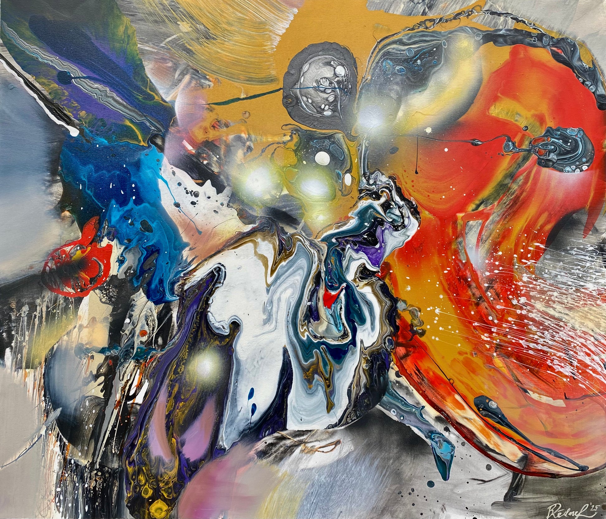 Autors: Baiba Rēdere Logina, "No haosa uz matēriju", eļļa un jaukata tehnika uz audekla, izmērs: 120 x 140 cm, 2025. gads.