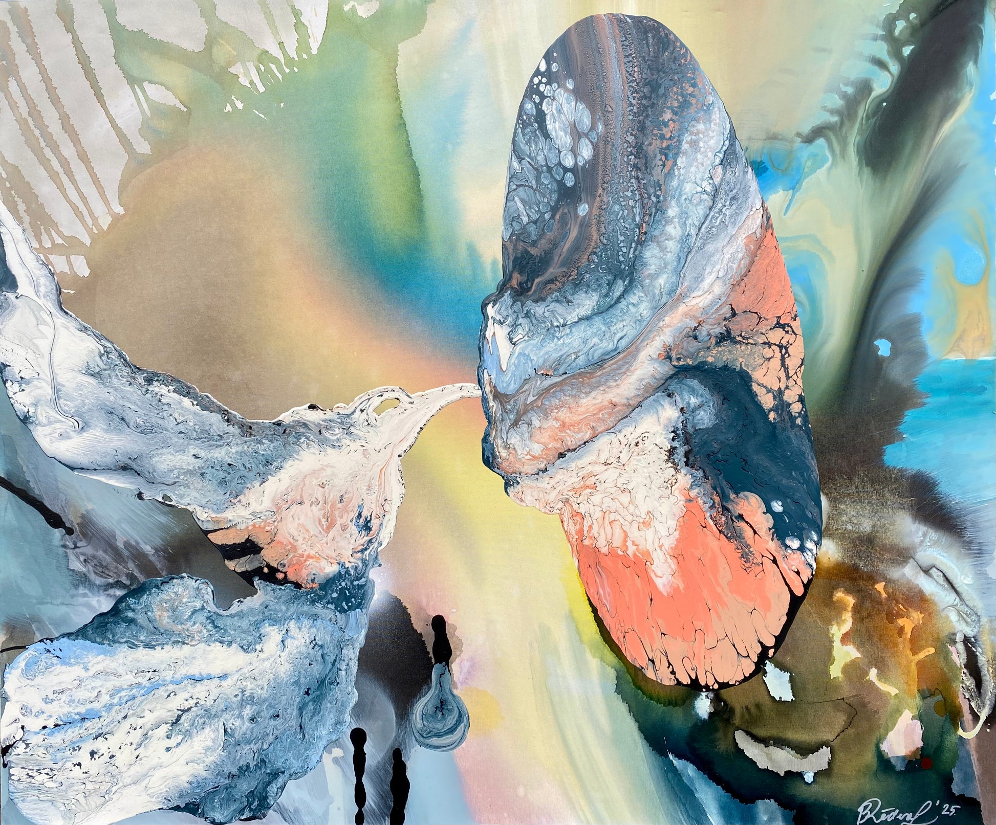 Autore: Baiba Redere Logina, "Pārpilnības plūsma", eļļa un jaukta tehnika uz audekla, izmērs: 90 x 155 cm, 2021. gads.