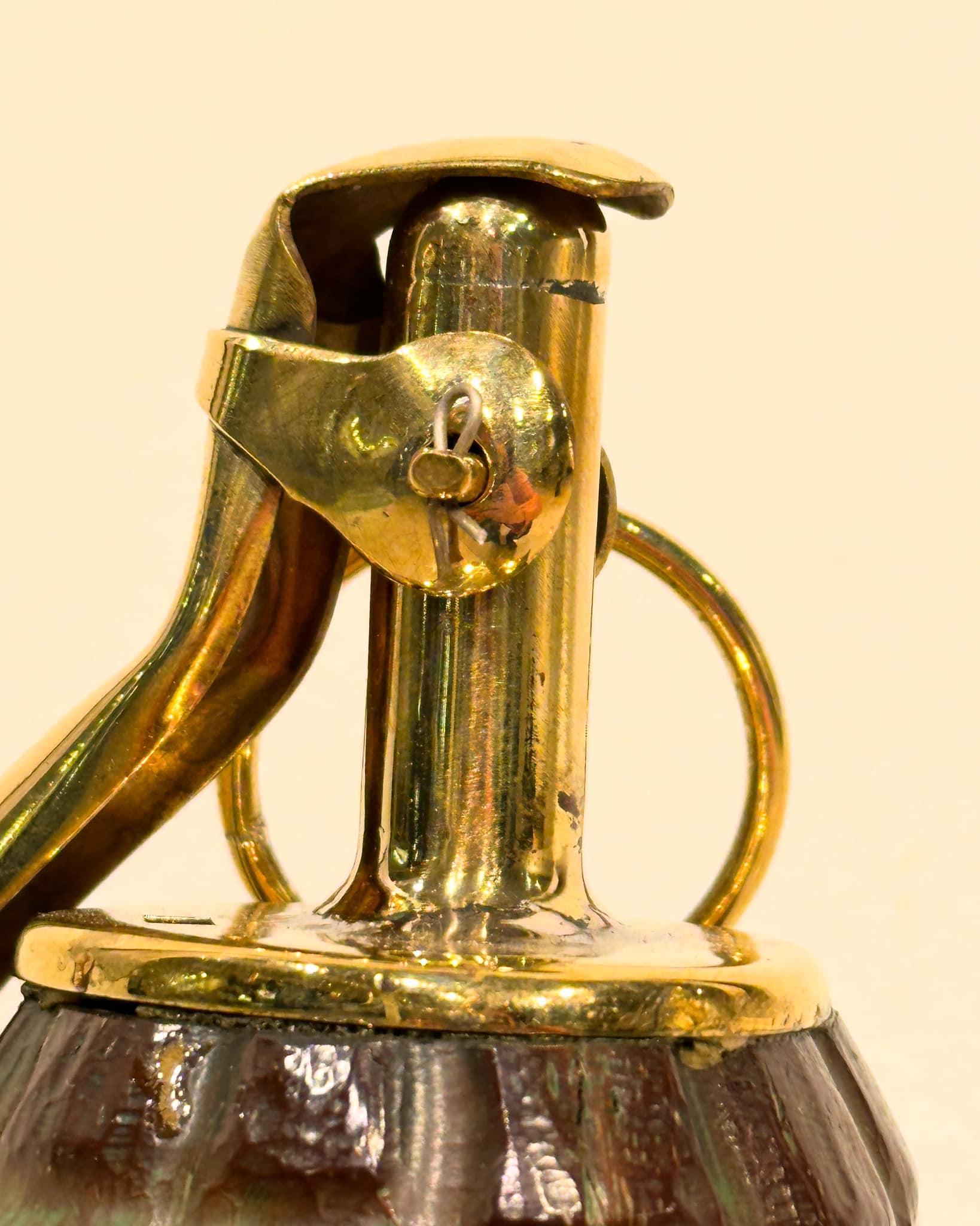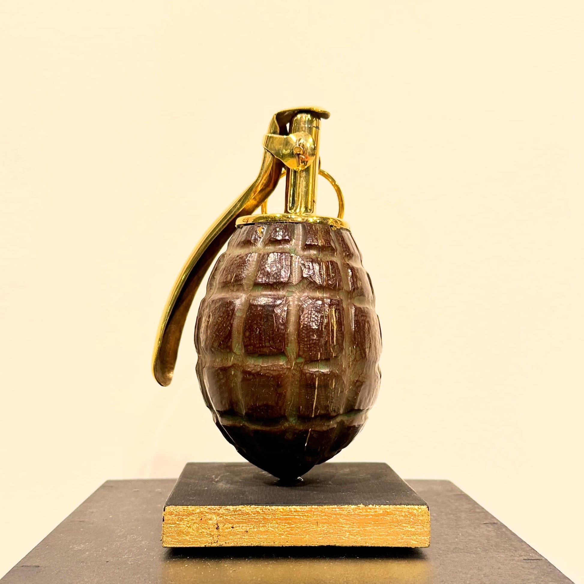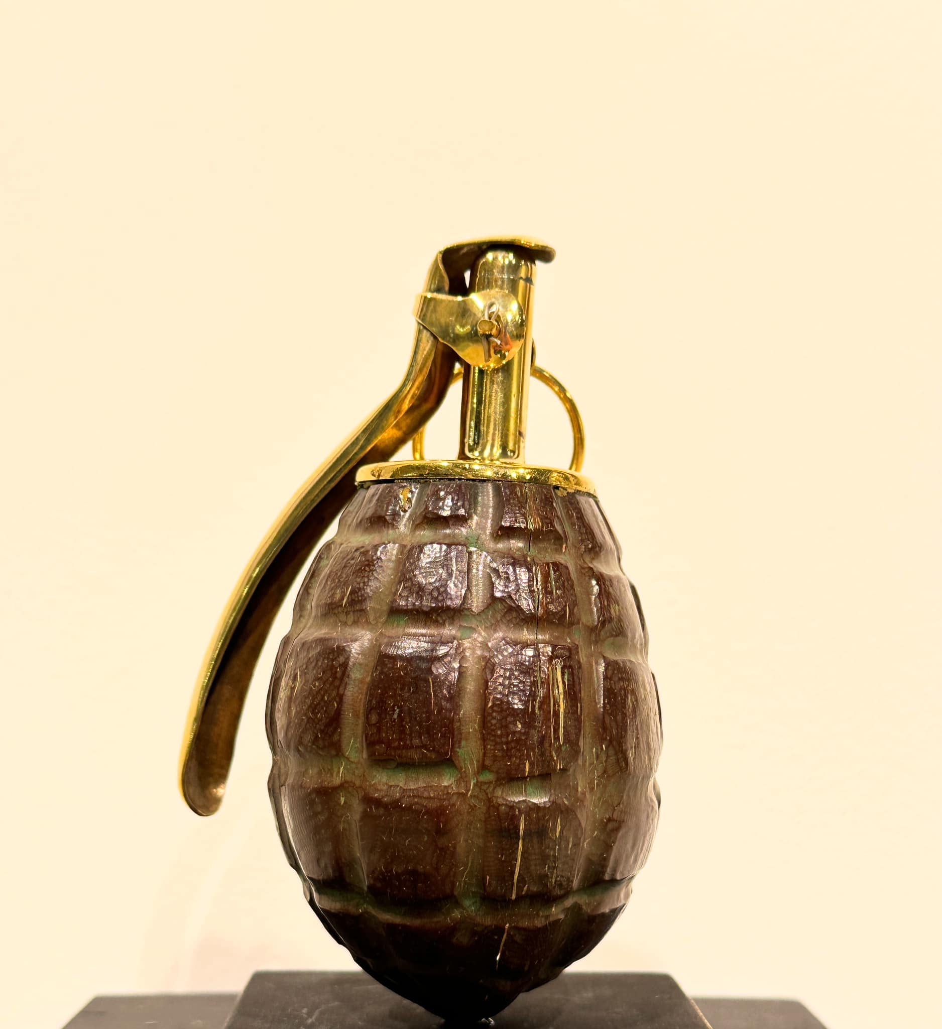 Autors: Armands Vecvanags, "Skūtā rieksta granāta", kokosrieksts, misiņš, izmērs: 19 x 12 x 10 cm, 2020 gads.