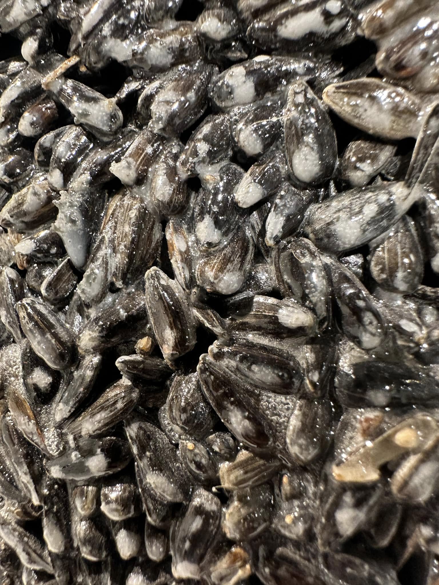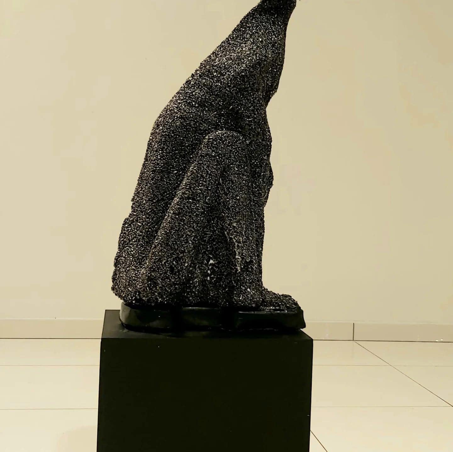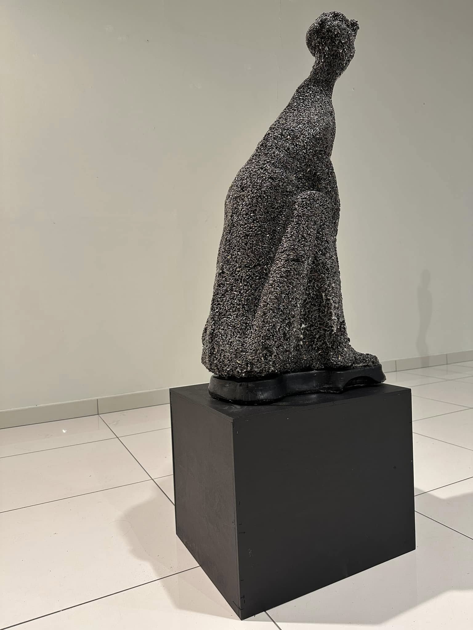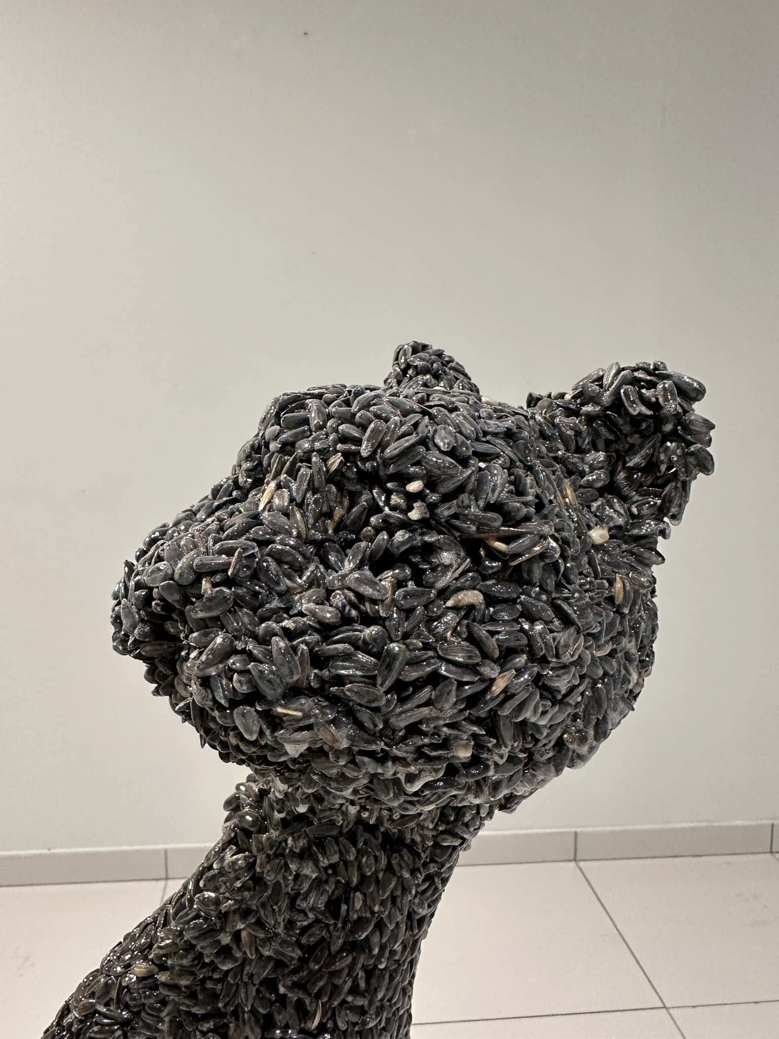 Autors: Armands Vecvanags, "Saulespuķu kaķis", saulespuķu sēklas, poliuretāna sveķi, izmērs: 110 x 40 x 50 cm, 2022 gads.