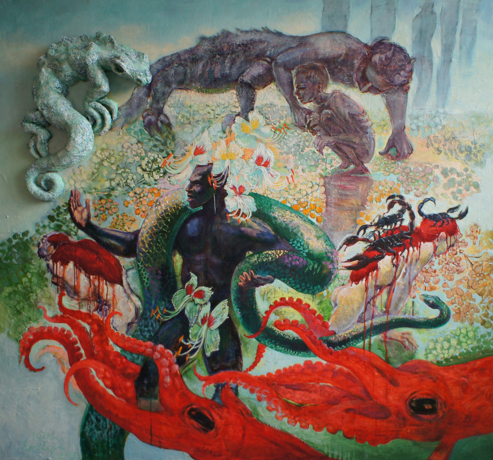 Автор: Велта Эмилия Платупе, "Царь пустынных змей, красный, как кровь, кальмар, пленники, съеденные скорпионами, и старая умная ящерица", масло на бумаге и холсте, размер: 140 х 150 x 10 см, 2019 год.