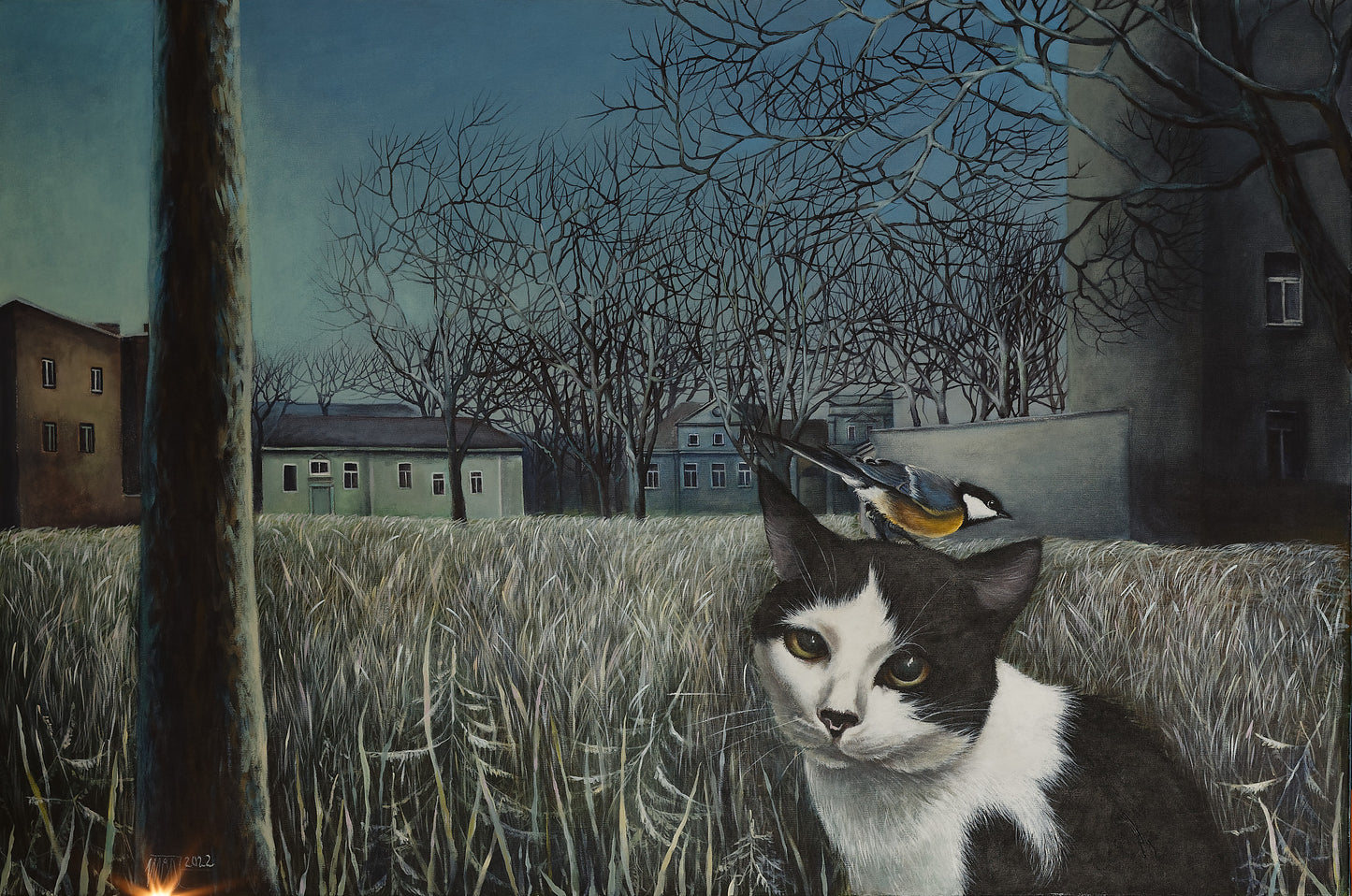 Autors: Inga Jurova, "Kad gulbji aizlido, tad trešā dienā snigs...", akrils uz audekla, izmērs: 80 x 120 cm, 2022. gads.
